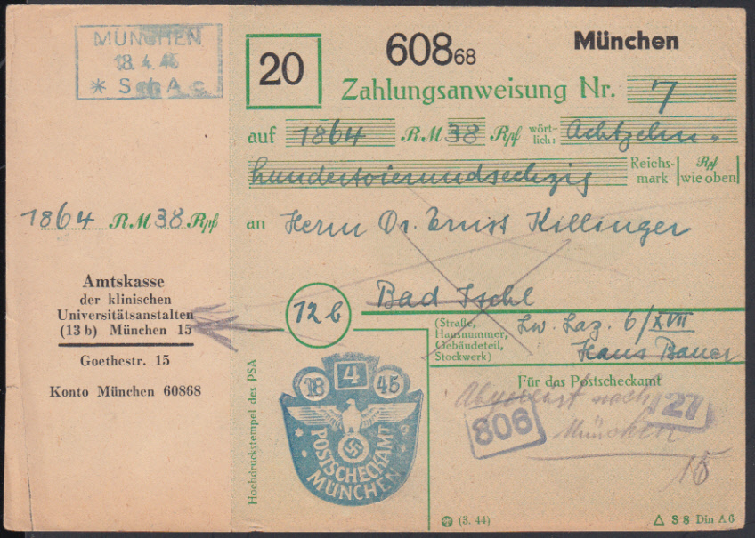 Nr. 38330 - Form - MÜNCHEN / 18.4.45 / * Sch A c, blauer R3 auf vorgedruckter Zahlungsanweisung der Universitätskliniken München nach Bad Ischl, dort am 28.4. eingegangen, Vermerk vom 9.10.45