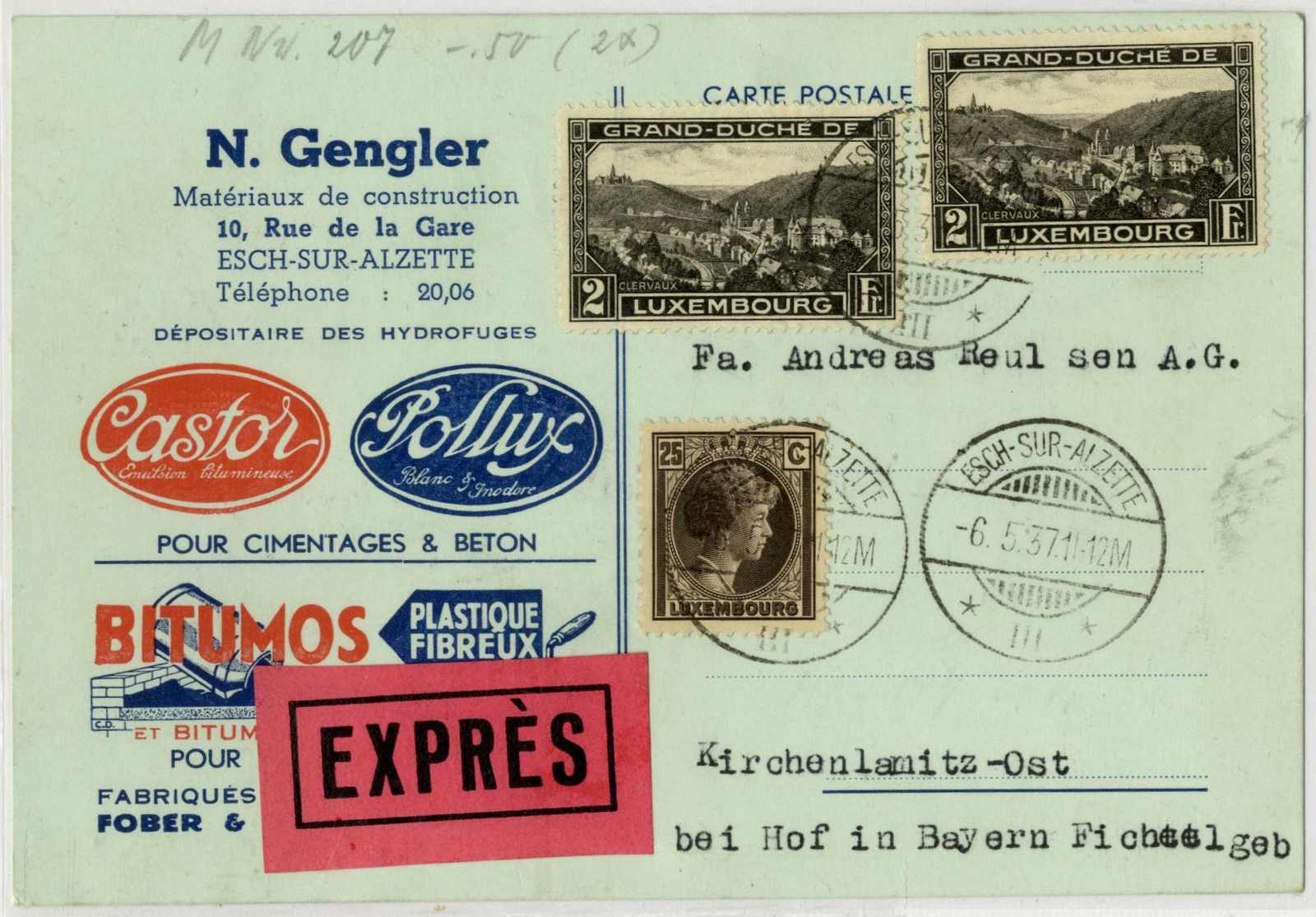 Nr. 38248 - Kte187, 207 (2) - ESCH-SUR-ALZETTE / 6.5.37, Firmenkarte per Eilboten nach Deutschland mit 25 C. Charlotte und 2 x 2 Fr. Landschaften, dekorativ